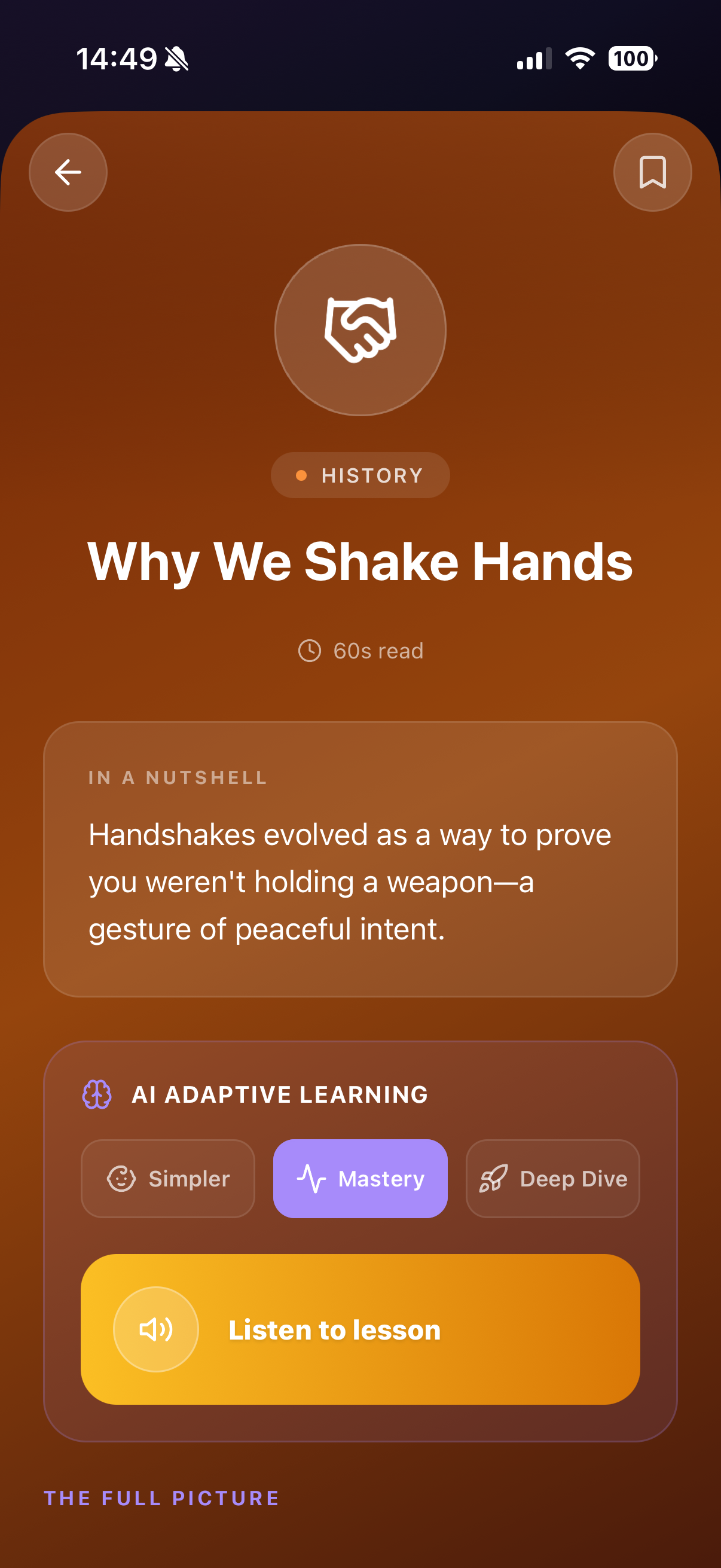 Discover one fascinating concept daily. Understand it deeply with AI explanations, audio learning, adaptive quizzes, and your personal AI tutor.