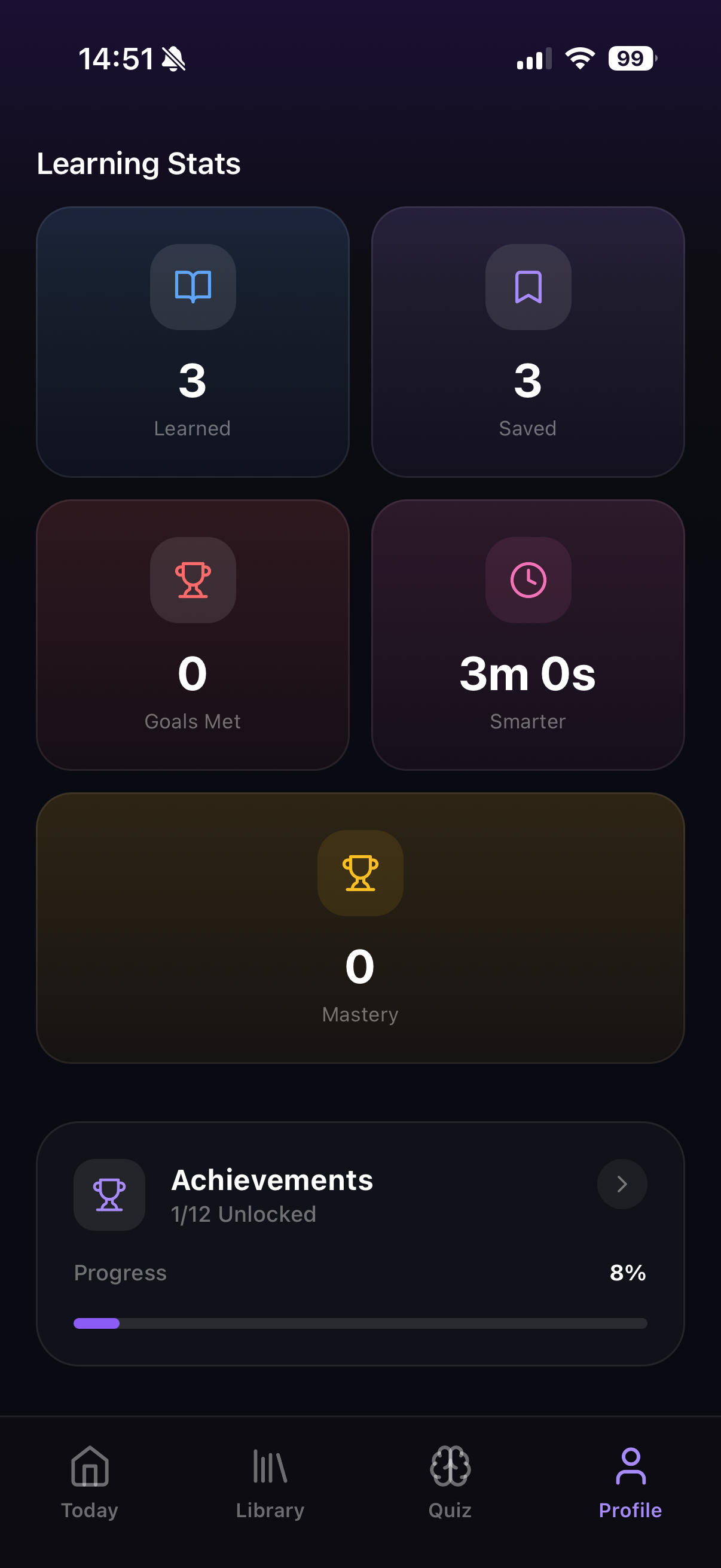 Track mastered concepts, flashcards, and structured learning paths. Watch your library grow as your mind expands.